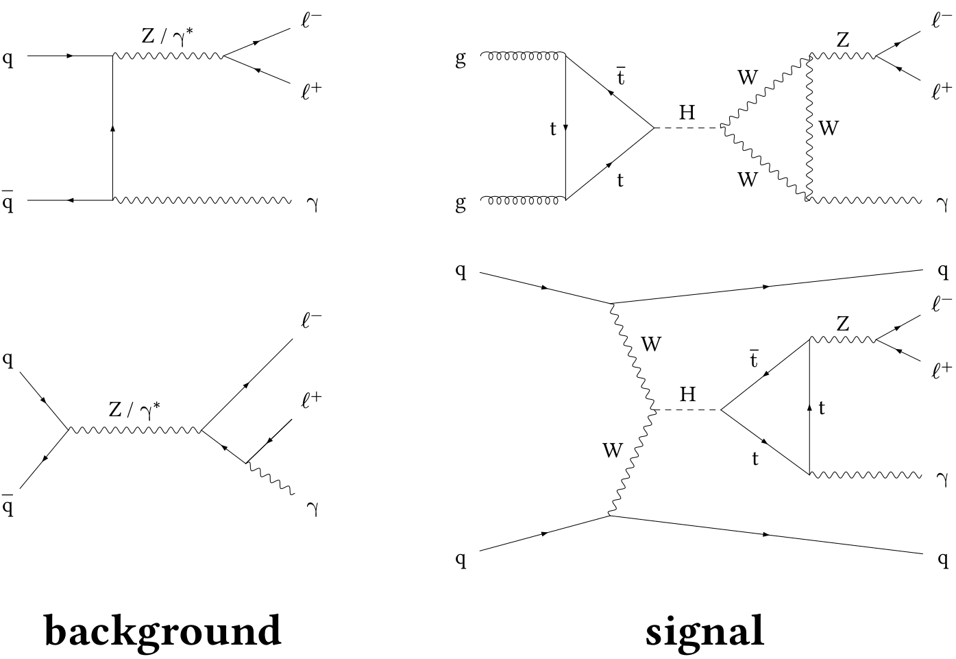 Figure 1: Examples of Feynman diagrams illustrating background and signal processes. For the signal processes, some Higgs boson production modes include additional particles in the final state used for categorization, as seen in the bottom right diagram.